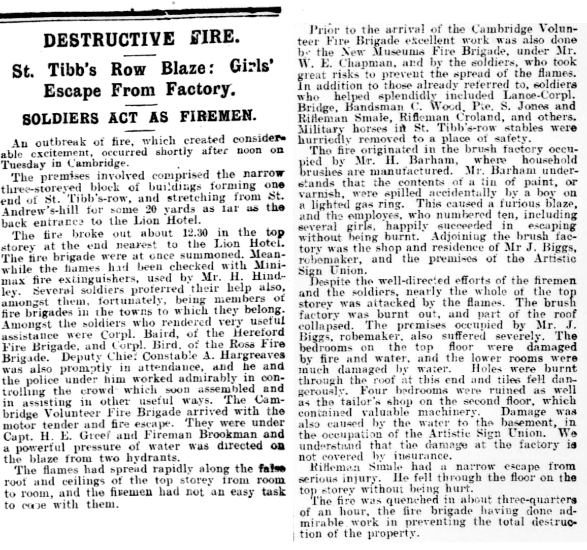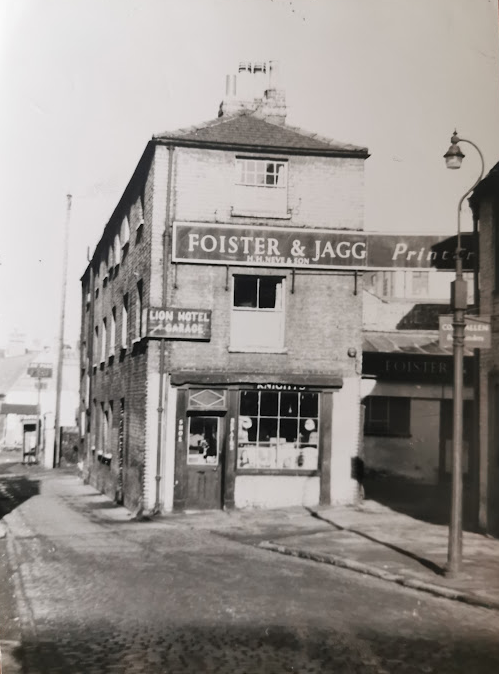 The sign on the building says Lion Hotel & Garage, the entrance to the Lion Yard was immediately to the north of the building on St Tibb’s Row and is just visible on the left of this photo..