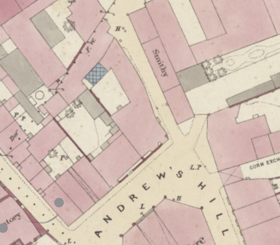 Excerpt from 1886 OS Map showing the St Andrew the Great Workhouse north of St Andrew’s Hill (marked Smithy)