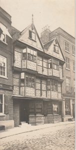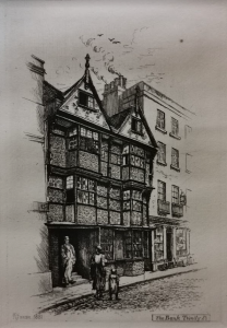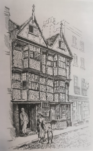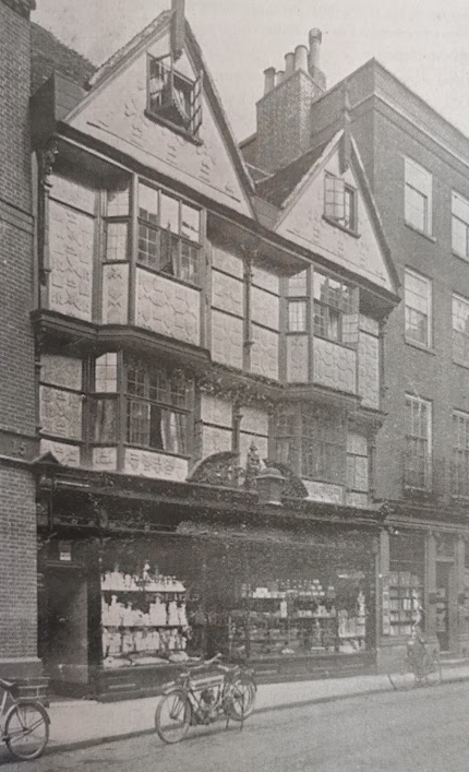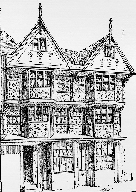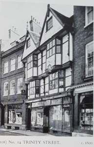 Turk's Head Coffee House c1876Once the Turk’s Head Inn (much restored), no. 14 shows the heights achieved by Cambridge builders by c.1600. Timber-framed with raised pargeting, it has overhanging upper storeys, two overhanging gables and canted oriel windows. (Pevsner)