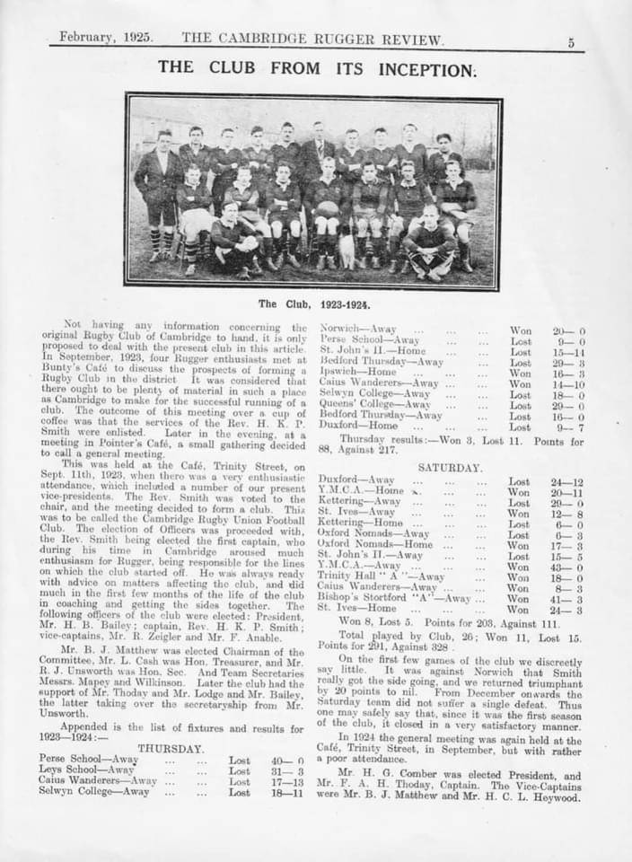 In early September 1923 four Rugger enthusiasts met at Bunty’s Cafe to discuss forming a club. The source of the name ‘Bunty’s’ is unknown at present but the inaugural meeting of the club was then held at the Cafe in Trinity Street on 11 September 1923.