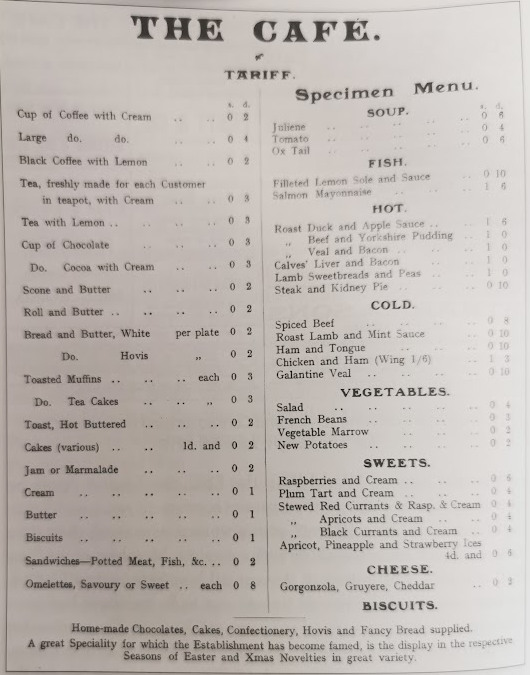The Great North Magazine described the cafe in 1913 as: The finest by far in the eastern Counties, with all its various apartments, all beautifully furnished, the snow-white table linen, the spruce waiting maids.