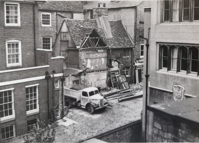 Back of buildings Trinity Street demolished for Angel Court, Trinity College. (MoC265/57)