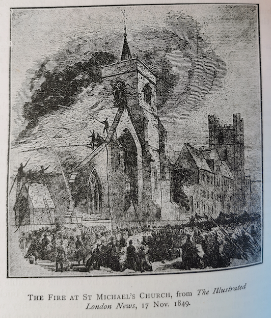 In 1849 Josiah Chater records in his diary a fire at the church and his assistance in passing buckets of water. The fire started at quarter to eleven and was extinguished before 1 o’clock. The water came from a pump in Trinity College kitchen and when this began to fail a double line of helpers created through New Court down to the river and back again. The fire had started in the flue of the church’s heating stove.