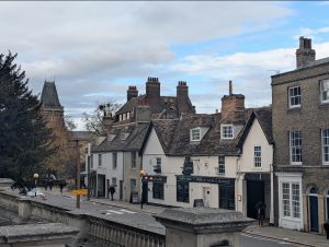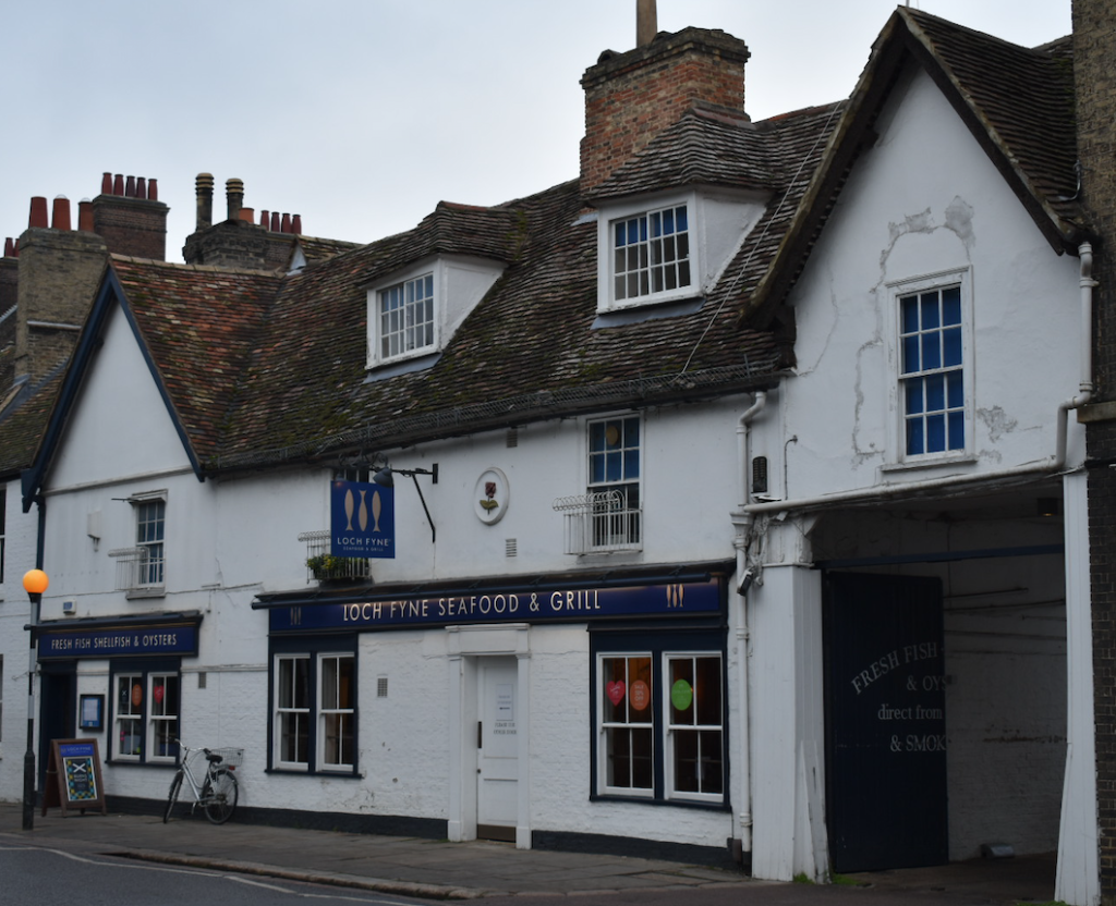 37 Trumpington Street CambridgeRoyal Commission Survey of Cambridge 1959: long rectangular range bordering the street was built in the 16th century; the structure includes a gabled N bay, now in separate occupation, and a gabled S bay containing an open carriageway… Inside, chamfered cross and longitudinal ceiling beans with plain and geometrical stops are exposed on the ground and first floors … some reset fragments of panelling of c. 1600 remain in the inn.