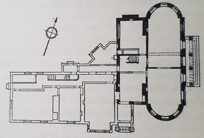 A plan of 1828 shows that the drive was moved southwards and a stable yard was built to the west. The outbuilding to the south is no longer depicted. By the next plan of 1840, the Lodge has a large, approximately square extension at the rear. This is also shown on the 1852 plan which labels the outbuilding to the south-west (first depicted on the 1828 plan) as ‘offices’. In 1875 Grove Lodge was again extended to the rear, almost doubling the size of the first extension. The entrance was moved from the east portico to the south side of the house. This involved creating a new entrance hall out of the south-west reception room, and slightly moving the position of the staircase which may have been replaced or remodelled.