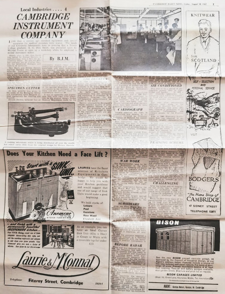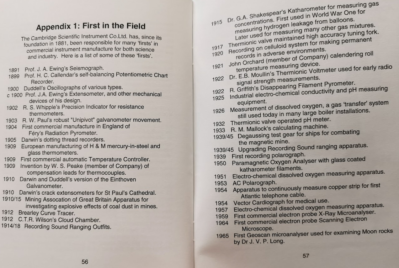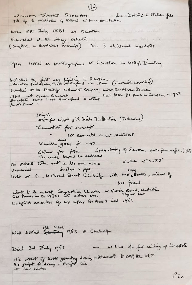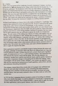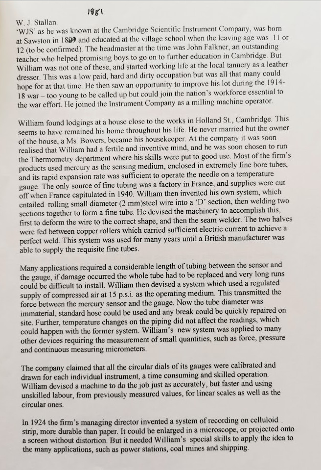 [William James Stallan] tried employment locally as a leather dresser in a Sawston tannery, which was his father’s trade, but his permanent work emerged to be as a laboratory assistant at the Cambridge Scientific Instrument Company in Carlyle Road (how typical of the man to have his home, chapel and works all conveniently near to him) where he was initially engaged as a milling machine operative. Under the leadership of Sir Horace Darwin William was to emerge gradually as an intelligent inventor of many gadgets and refinements – some too complicated to describe here but as was the custom in those days, he only rarely gained credit or recognition when patents were registered by the company. It was enough for him to be inventing successfully and to be mastering problems.