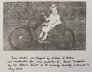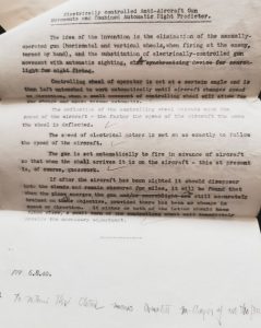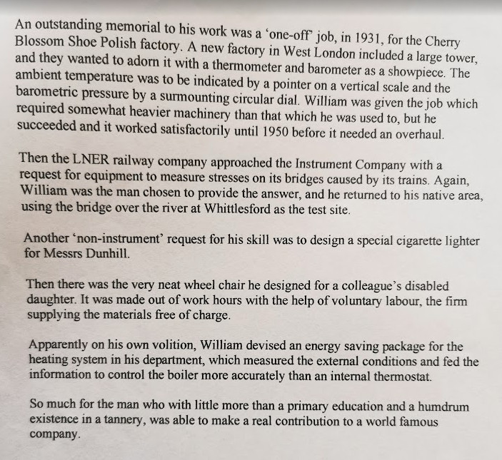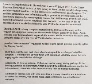 To return to the listing of products from William’s fertile mind we note: a machine to calibrate easily the circular dials of gauges used by the Company; for the L.N.E.R. railway company her devised equipment to measure stresses on its bridges, and used the bridge at Whittlesford for his tests. He worked alongside Gwen Raverat (née Darwin), the famous wood engraver, artist an author in 1940, when she wished to contribute to war work. In 1945 he patented improvements relating to rip-cord devices for parachutes; perfected an electrically controlled anti-aircraft gun with automatic site predictor. Then there was a micrometer for measuring the relief heights of colour photographs and cine films. he even made a special cigarette lighter for Messrs. Dunhill, and a 3 wheeler vehicle for Sheila Turkentine, a disabled girl whose family he knew. For the heating system in his department he put together an energy saving package which measured the external conditions and fed the information to control the boiler more accurately than an internal thermostat. Technical problems for him just existed to be solved.