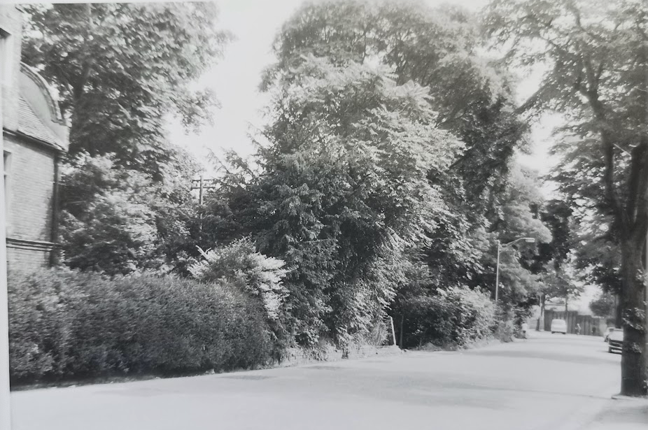 Chesterton Hall, Chesterton Road, Aug 1969, with post showing position of new road from bridge (MoC 55/166/69)