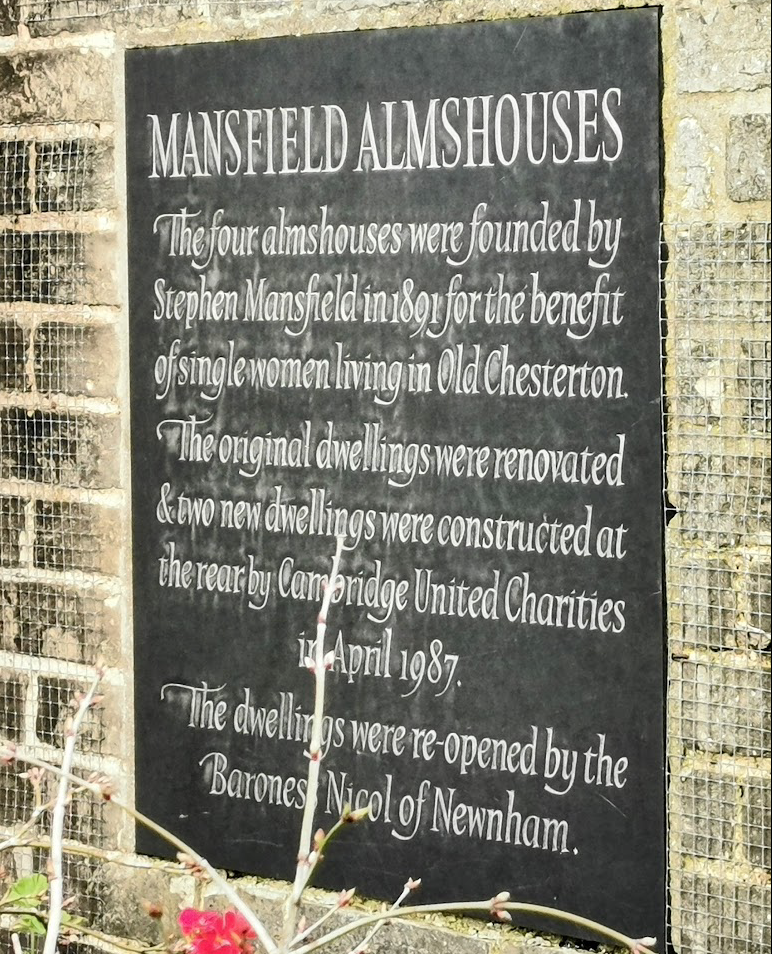 Mansfield Almshouses, Church Street, ChestertonThe Mansfield Almshouses were founded in 1891 for the benefit of single women in Chesterton.