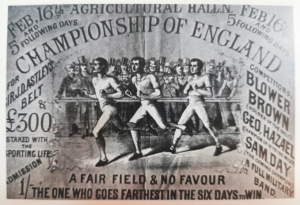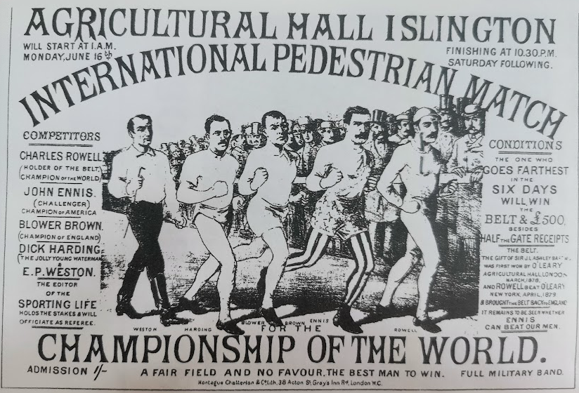 21.6.1879: (English Lakes Visitor) SIX DAYS’ WALKING MATCH, Once more the Agricultural Hall is the scene of a trial of endurance, this time for the “long-distance championship of the world” belt and a sweepstake amounting to £500, together with a large percentage of the gate receipts. When the belt was originally presented for competition, Daniel O’Leary, of Chicago, won it, beating Vaughan and eighteen others, and thus the belt was taken to the United States. Here O’Leary was challenged by another American named Hughes, who had to put up with en easy defeat. Then Charles Rowell, of Cambridge, was deputed by the mother country to meet the redoubtable Yankee; and, accordingly, in the early part of the spring Rowell defeated O’Leary, Ennis, and Harriman in New York, and brought back the coveted trophy. Ennis. of Chicago, U.S.A., challenged him immediately, hence the present contest. On the match being ratified, “Blower” Brown, of Fulham, the English champion (holder of the second Astley belt) ; R. Harding, of Blackwell (hitherto better known in connection with sculling than pedestrianism); and B. P. Weston, of Providence, U.S.A., joined issue, and deposited their several “hundreds” to make a sweepstake. Up to last week everything went well, as Rowell was considered to have a great chance ; but while training he ran a nail into his heel, and consequently he was compelled to resign the belt to be competed for by the others. The start took place in the presence of a large number of people.