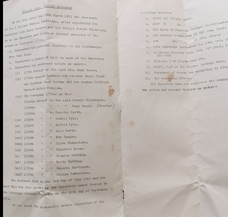 Uncle died in 1953, leaving a well-considered will, bequeathing all personal chattels to his housekeeper, Mrs Mary Bower, who afterwards gave me his pig-skin wallet containing little brass tools for working on small objects. As might be expected his bequests to his relations and friends had been calculated carefully into 4th, 5th or 28th parts of his estate, and he decreed the sale of his shares in the Cambridge Instrument Co. Ltd and Messrs Chivers and Sons.