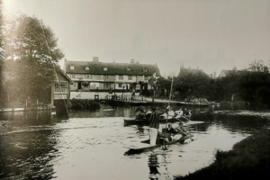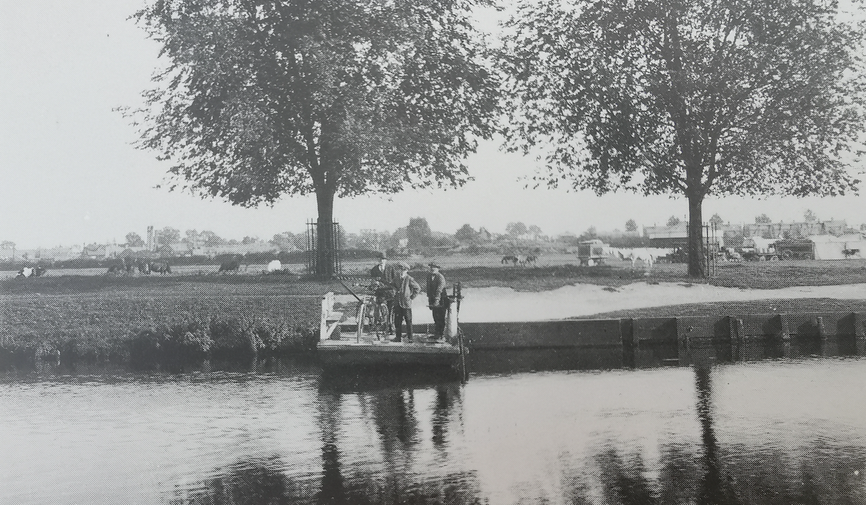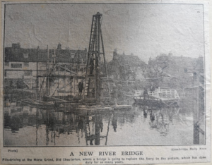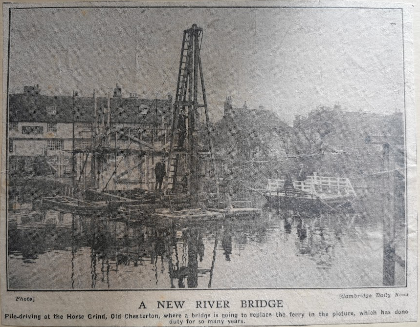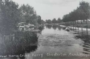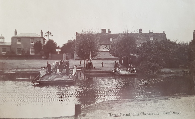The photo shows the Horse grind ferry opposite the Green Dragon, Chesterton. There was a smaller ferry for pedestrians. The ferries were replaced by a footbridge in 1935, the last year of the Stourbridge Fair. By then ‘Old Alf’ had worked his ferry for 34 years. This was also the location for baptisms in the C18th. In 1767 a crowd of 1,500 gathered to watch.