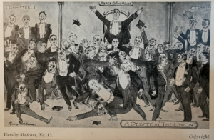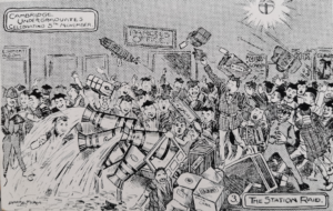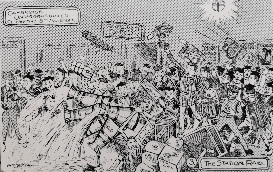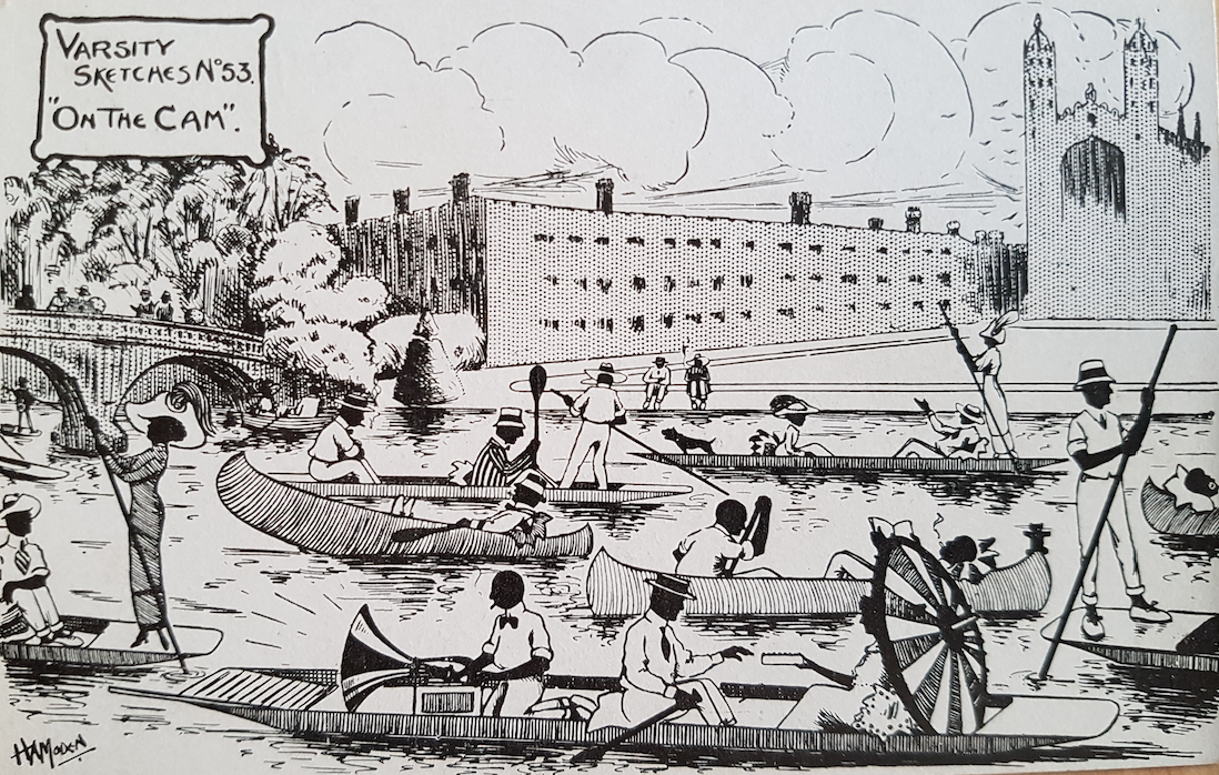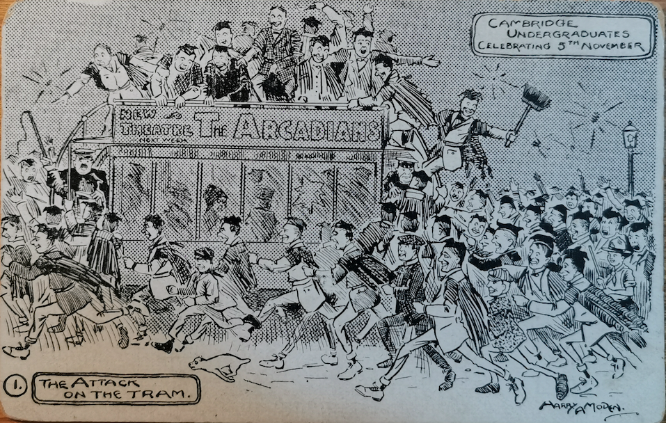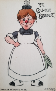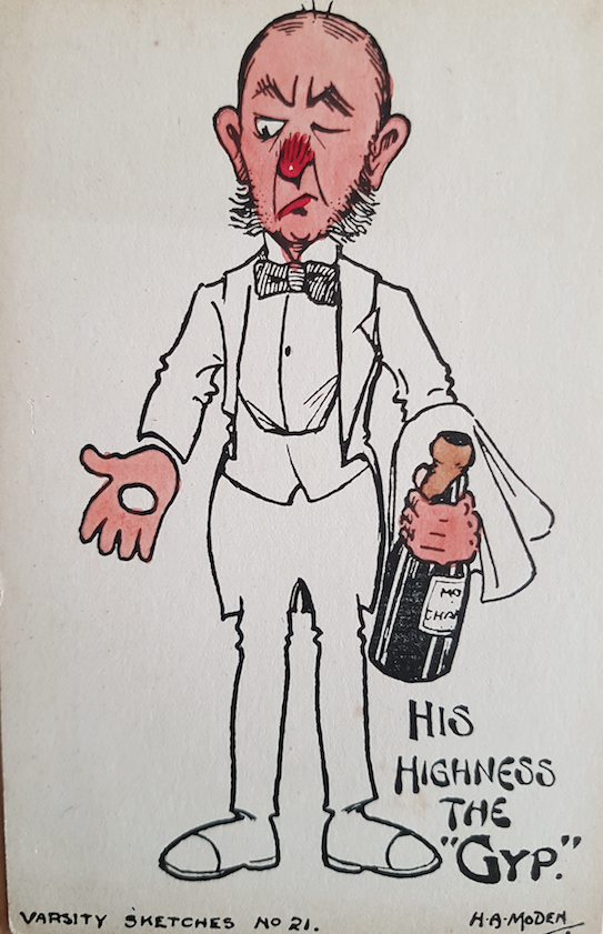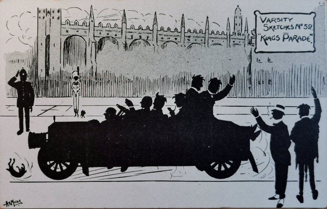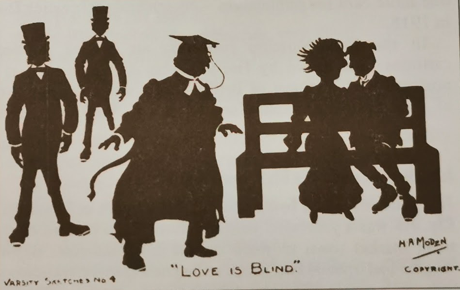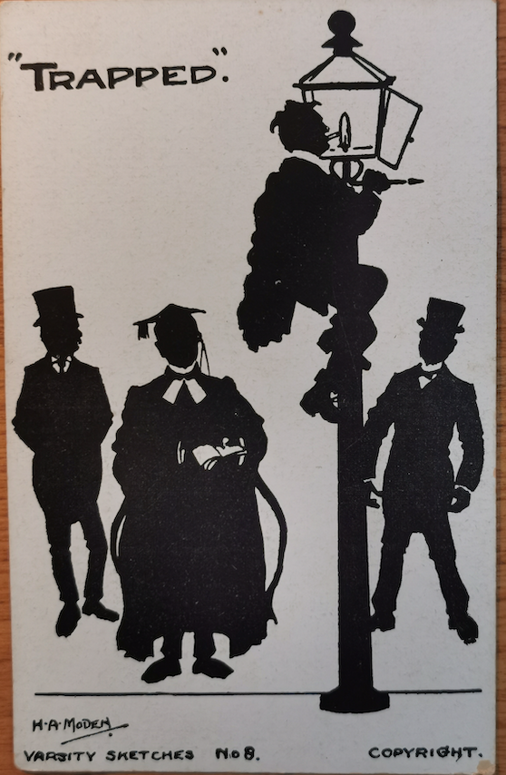 Before his marriage Harry had lived with his family at The Wheatsheaf, 3 Market Hill. It was during the period 1903 to 1914 that as well as his day time job, he was most prolific as an artist and cartoonist. He produced many humorous sketches of Cambridge life, many of which were printed as postcards on sale in local shops. He would visit the New Theatre and made silhouette sketches of the cast of each production. He also designed menu cards, programme covers and advertisements for both local and national products. However, his health suffered, and on doctor’s advice he started to take more exercise and moved from the house in Humberstone Road, to Milton Road, in 1914. His artistic output reduced significantly and after this time he was mostly forgotten as a local artist.