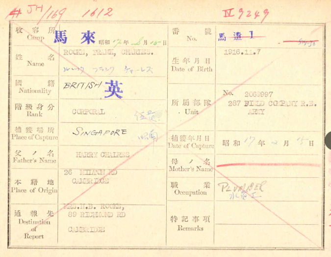 Frank Charles Rooke: Corporal, 2069997, 287 Field Coy., Royal Engineers, who died on Saturday 24 July 1943. Age 26. Buried in THANBYUZAYAT WAR CEMETERY Myanmar. Son of Harry Charles and Alice Maud Rooke, of Cambridge; husband of Nellie Beatrice Rooke, of Cambridge.