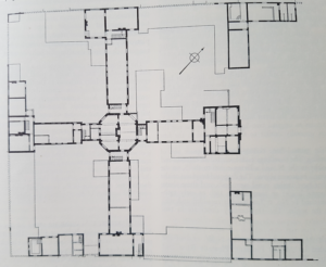 According to 1959 Royal Commission on Historical Monuments Survey of Cambridge the land for the workhouse was purchased in 1836 and built at a cost of £5,716 to a design by John Smith. At the time of the Royal Commission report significant parts of the main buildings survived and it is described as having a remarkable plan devised for the special purposes of the workhouse.