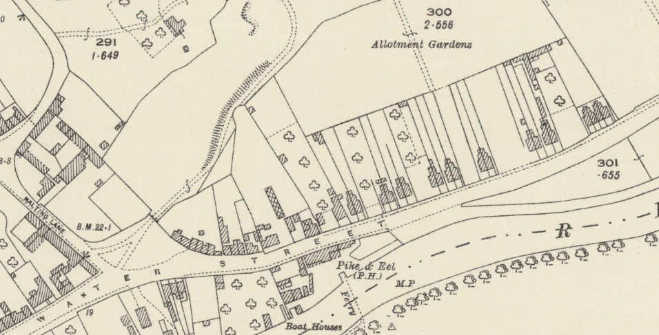 Eastern end of Water Street in 1901 OS mapThe original buildings for this stretch of Water Street have all gone but the modern house roughly follow the curve of the old.