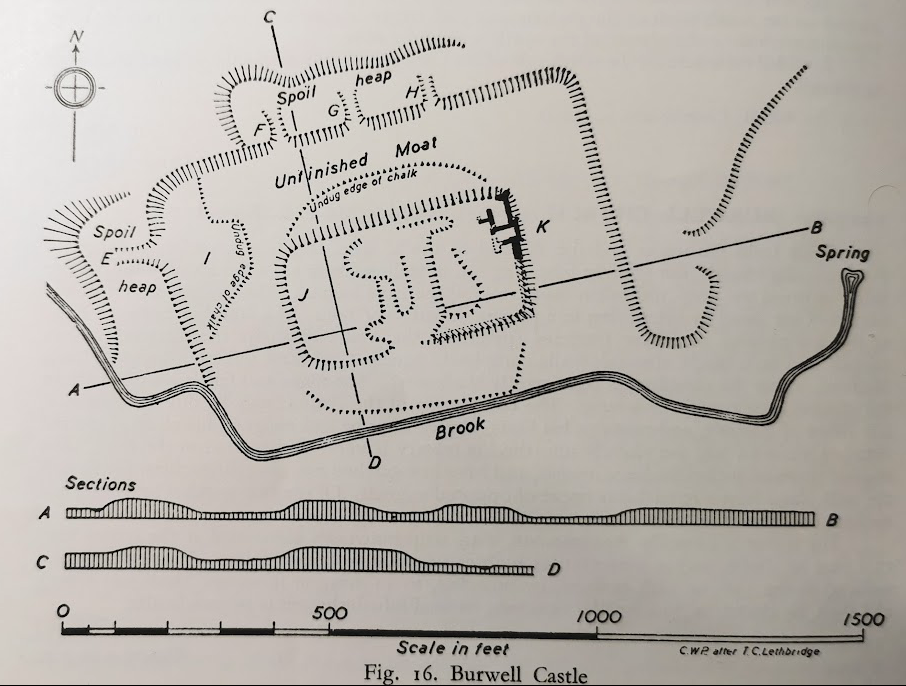 Geoffrey de Mandeville, Earl of Essex, attacked Burwell in 1144 when the castle was still unfinished, but during the operation he was hit by a crossbow bolt; he retired to nearby Mildenhall, where he died from the injury. After Geoffrey’s death the castle was never completed, although a stone gatehouse was completed on the site, suggesting a period of further occupation. The Abbot of Ramsey built a chapel on the site around 1246, and the site was finally abandoned in the 15th century.