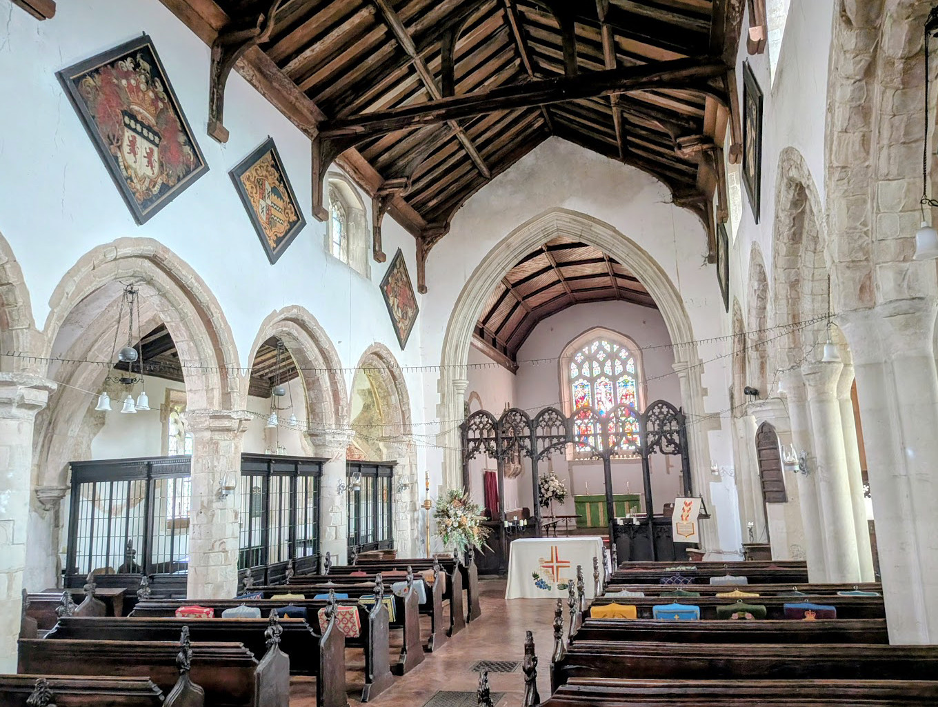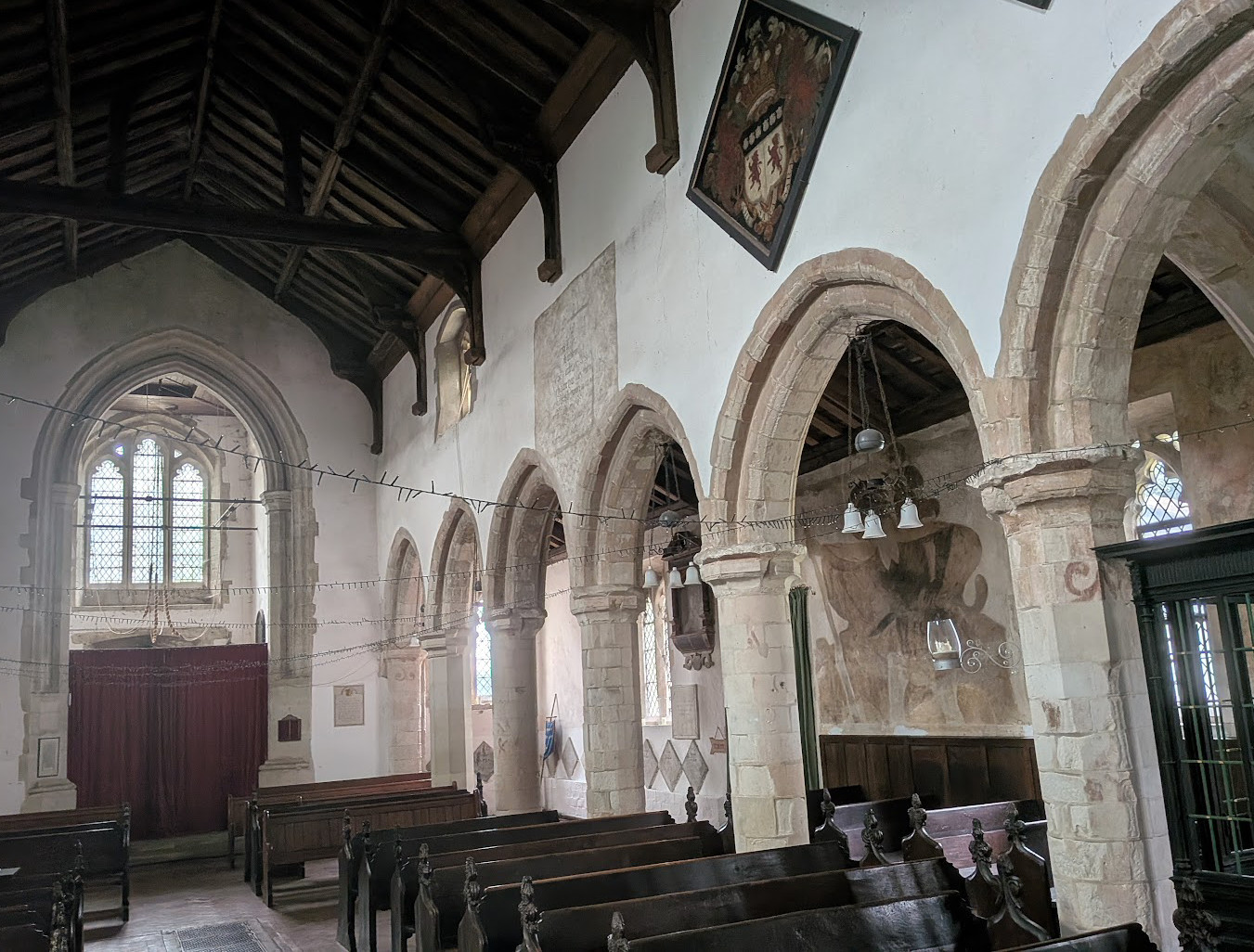 St Margaret, Chippenham (RGL2025)Parish church. Chancel and part of south-east nave wall C12. North-west aisle, and Lady Chapel with altar recess and original fresco C13. Nave arcades C13. The C15 fabric dates from a fire in 1447. Prior Robert Botyll, a Knight’s Hospitaller, whose armorial shield was depicted on the fresco of St Michael in the Lady Chapel, was perhaps the benefactor. The aisles were rebuilt and refenestrated, the clerestory, roofs, and tower are C15.