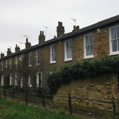 A pair of late C18 buff coloured gault brick houses stuccoed on the front, with stuccoed rusticated quoins.