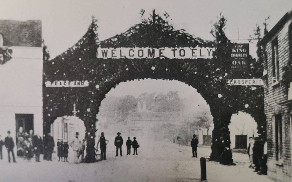 County Agricultural Show, 1887. Arch between 'The Angel' and 'King Charles in the Oak' in Station Road, Ely