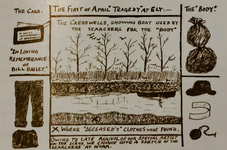 ‘The Hoax! Most people of Ely, and many outside the city, can doubtless remember the Ely Hoax, or the River Mystery of All Fools’ Day 1905 – how certain articles of clothing (hat, coat, waistcoat, collar, tie, trousers and watch) were found in the early morning lying on the Cresswells bank – how footprints leading into the water pointed to a ‘deliberate suicide’ – how a diligent search was maintained for many hours in the presence of a crowd of sightseers …. The opportunity was seized upon by the publisher of picture postcards. In a few days Hoax Postcards were ‘ all the rage’ and nearly two thousand of Nos. One and Two were sold …. the Hoax was aimed at a particularly unpopular policeman.