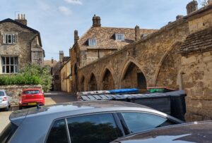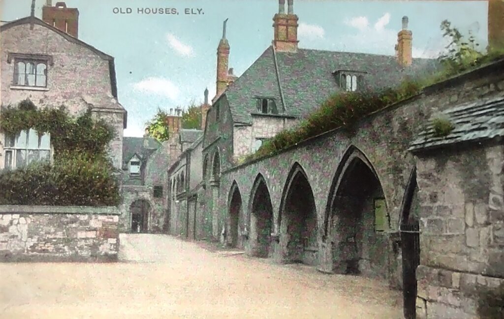 Firmary Lane, Ely (undated)Then and now (David Gent) – Ely – Looking south-east along Firmary (Infirmary) Lane, south of Ely Cathedral, showing the doorway and arches of the Infirmary Chapel. Just one of the many historic buildings you come across as you wander round this beautiful city. According to the Historic England website, the building on the left was originally a Blood Letting House. It was built in the early l4th century to accommodate the monks who underwent the Ely practice of blood letting once every 6 weeks.
