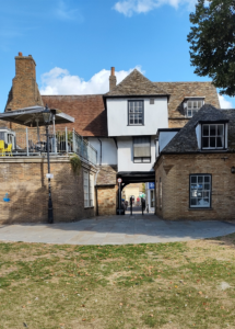 The view from the Cathedral through the gate towards the High Street. The description from the Heritage Gateway website is “Steeple Gate is a medieval gateway that originally led into area of the lay peoples’ cemetery. It was a tower gateway with two tenements on each side that belonged to the prior and convent. The current wooden gate dates from the medieval period. Vaulted cellars beneath it date from c.1330, but the current structure dates from the 16th century. The timber-framed gateway at Steeple Gate was built during the Tudor period, but has retained its name from at least 1417, when it is mentioned in the survey of Ely. It is one of four tenements which are recorded as abutting on the gateway itself, two on the east and two on the west. It was one of the properties of the Sacrist of the monastery, and formed the gateway to the burial ground of the parish church of the Holy Cross, which abutted on the N side of the nave of the cathedral.
