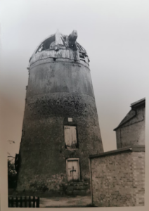 The windmill at Haddenham, also known as Great Mill, is one of four surviving complete tower mills in Cambridgeshire, and dates to 1803. The mill was built for Daniel Cockle, and was operated by the Cockle family and successive owners until just after the end of the Second World War, after which time it remained unused and unmaintained. The mill sails were blown off in 1969, followed by the collapse of the mill cap and fantail.