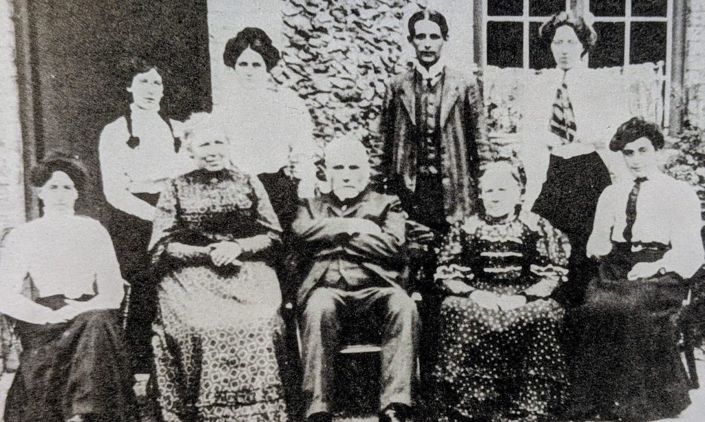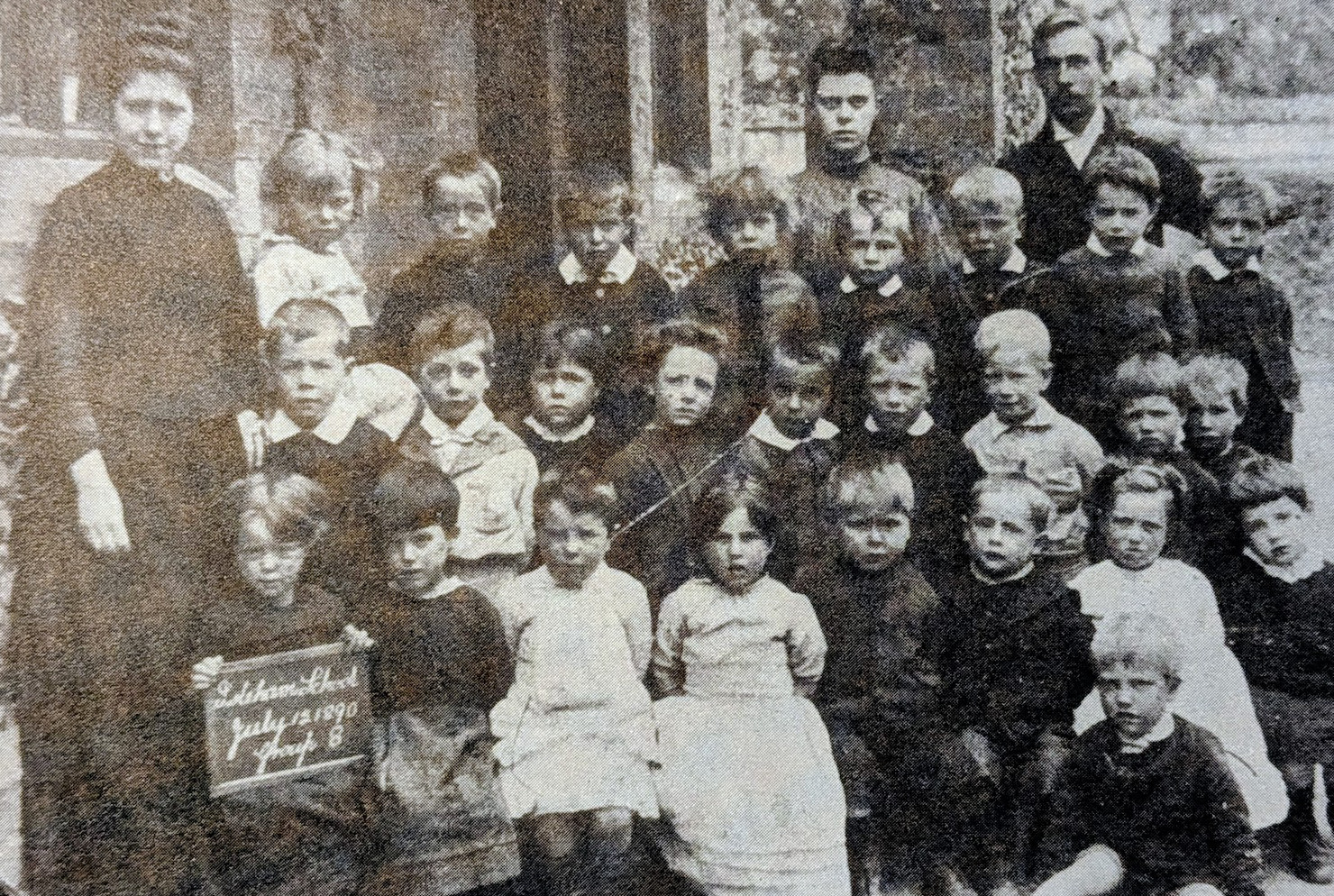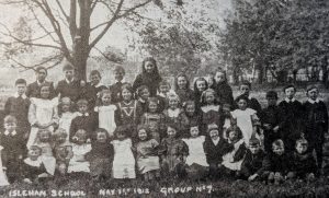 Miss Bradley on left, later Mrs Billy Curtis. Schoolmaster is William Fyson. On the left of the middle row, Robert Audus and then Ebby Diver