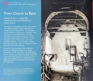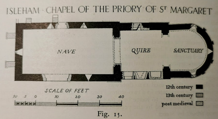 Priory chapel, Isleham (Religious Houses of Cambs, 1988)A small Benedictine priory of c.1080-90 built by Count John and given to the abbey of St. Jacut in Brittany. Later it was used as a barn and now it is in the care of the Department of the Environment. Although restoration has taken place, the priory is substantially intact and remains a rare example of Romanesque work.