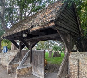 Lych gate, much repaired and restored, but of late C15 or early C16 origin. (Historic England)
