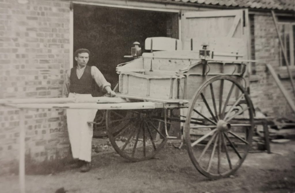 Joe Atkins, carpenter, verger at St George's church and Sunday school teacher. 1902 beside the first cart he ever made. (Cambs Collection)1911 Hythe Lane