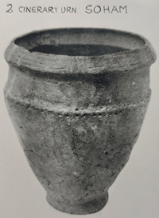 Bronze Age cinerary urn, SohamCyril Fox in The Archaeology of the Cambridge Area notes that a Bronze Age cinerary urn was found in Clipsel Field. There was a small bronze pin and a skeleton.