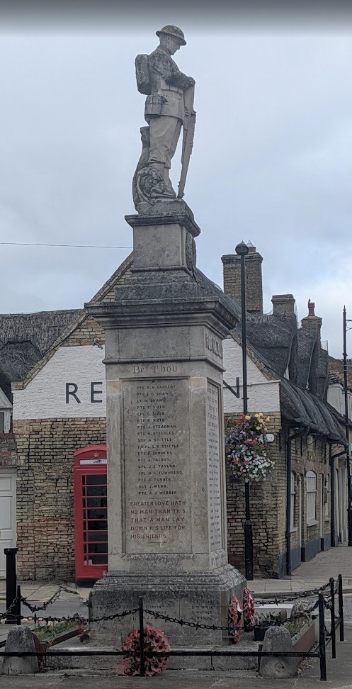 War Memorial of stone. Figure of a standing infantry man with head bowed and hands resting on rifle. Leaded lettering in recessed panels to sides of base and to plinth. (Historic England)