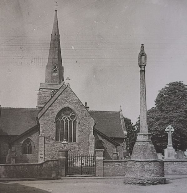 The photo shows the cross and church. According to Vanishing Cambridgeshire, p.167, the church yard wall was moved in 1926 and 1928 to allow for road improvements. The 15th century cross had had a flight of steps in the 18th century but these were removed at some point.