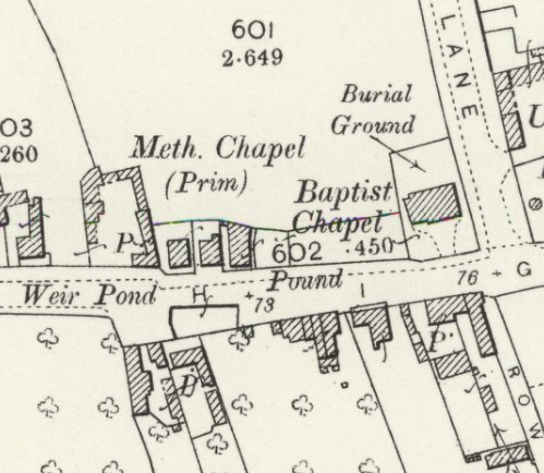 Primitive Methodist Chapel (l) weit pond (r), Sutton 1900sNear the Primitive Methodist Hall were the Reading Rooms and Jubilee Hall. The Hall was later a cinema and then the Conservative Club. Beyond the Club was the Pound for stray animals. The Weir Pond is on the right.