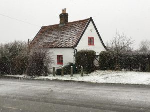 The cottage was originally two “one up one down” dwellings; it is still possible to see where the two front doors were and there is evidence of the dividing wall. It is not known whether is was a farm labourer’s cottage or associated with either the nearby clunch quarry (possibly the source of the clunch used to construct the gable ends), or the windmill that stood on the hill behind the cottage. What is known is that it was the village Post Office until the middle of the last century; some older residents of the village still refer to it as “the old Post Office”