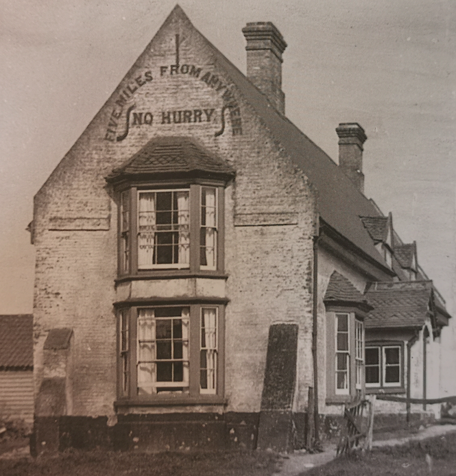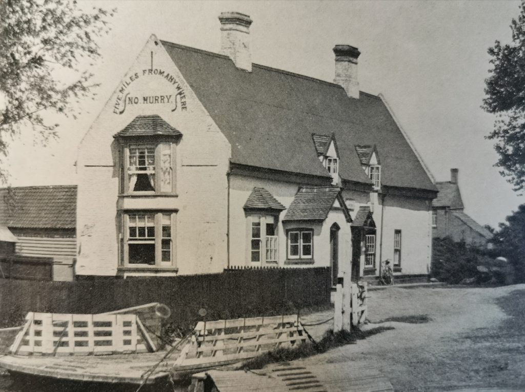 The pub was built under thatch in 1811 but this was replaced by corrugated iron in the 1890s. The Lord Nelson was rechristened Five Miles from Anywhere – No Hurry in the 1860s by Richard Ramsey Fielder, self proclaimed His Majesty the King of Upware. From 1851 it was the headquarters of the Upware Republic, a society of Cambridge undergraduates that included Samuel Butler.