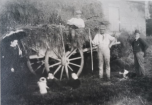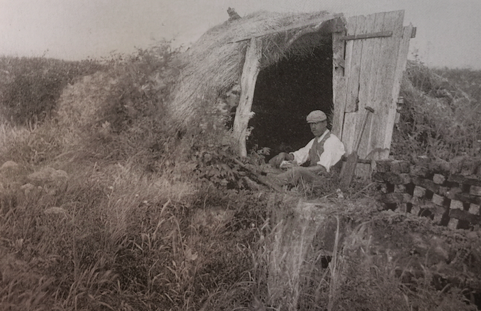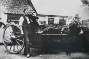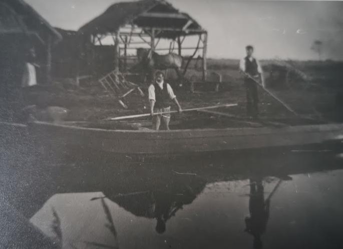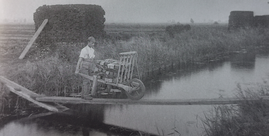 J Hall and H Bailey of Wicken staing in a turf boat – note the covered stacks of turf behind c.1890 (MoC77/68)