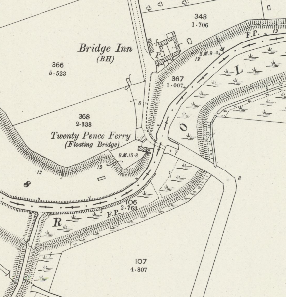 This was a floating bridge attached by chains on either side of the river. By 1903 it was in poor condition. The owner refused to do any repairs as they argues a bridge was needed. However, there was a public road on one side and a private, the Aldreth Causeway, on the other.