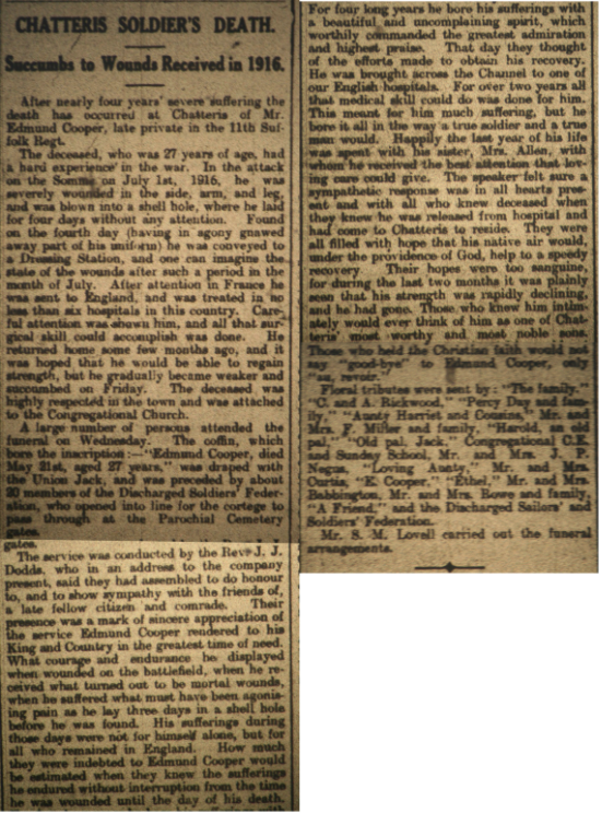 Edmund joined the Cambridge Volunteer Battalion in 1915. He was wounded in three places on the first day of the Battle of the Somme. After stays in various hospitals he returned to Chatteris at the beginning of 1920 to be nursed by his sister until his death in May.