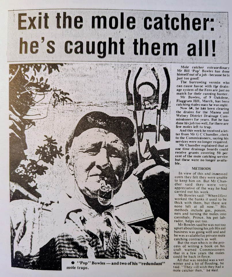 Bill Bowles’s autobiography describes in detail his life at Flaggrass including the method of mole catching. A farmer once bet 10s him that he couldn’t clear his land within a week. He did but the farmer wouldn’t pay. So Bill let loose on his land as many moles as he could find. Once he caught an albino mole.