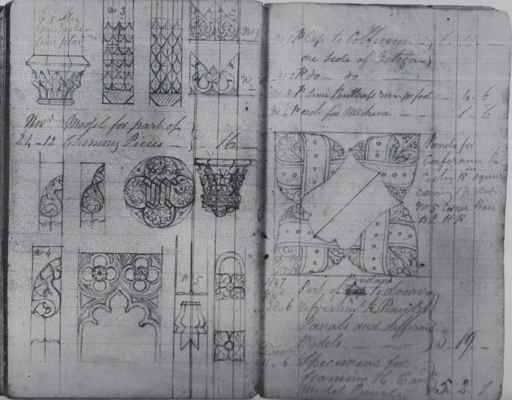 These are two pages from George Kett’s notebook during the time that he worked on the Palace of Westminster under the direction of the architect Augustus Pugin. Kett was chosen to carve the Royal Coat of Arms in the Chamber of the House of Lords.