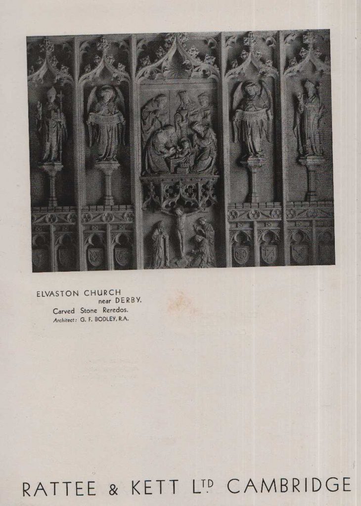 The chancel of Elvaston church was restored and lengthened under the direction of G F Bodley in 1904. There is no window at the east end but a large reredos of carved white clunch constructed by Rattee and Kett.
