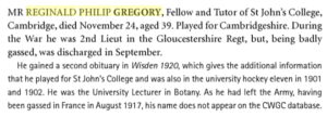 Reginald Philip Gregory, Fellow St John’s and Lecturer in Botany and cricketer