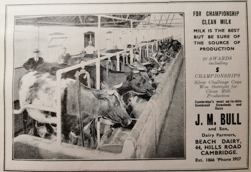 In 1941 a string of bombs were dropped over the city finishing up along Hills Road, very near Bull’s Dairy. Two people were killed nearby and the windows of the dairy were blown out.