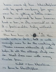 My darling Cled [Claude], Our thoughts are with you today and wondering what you are going to do to celebrate. Cambridge has gone quite mad but we are just enjoying everything in perfect weather and not taking part much ourselves. We had dinner at Kings Parade with Mum and then sat at the windows to see the fun on the parade. There was a very impressive gathering on the Market Hill. The Mayor and all his satalites [sic]on the balcony and all the decorations were very colourful and the proclamation and hymn singing very impressive. I hope Christopher will remember it – he joined in the hymn singing of”Land of Hope and Glory.”