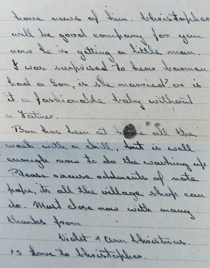 … We’ve been to see the most wonderful bonfire on the Common with searchlights lighting up the sky and forming a huge Union Jack over the fire. We took Christopher and I should think it is a sight he will long remember.I have never seen anything to equal it. Christopher and I are staying the night with Iris [friend of Eve] or she would be alone. Christopher has a nice little bedroom to himself and is very thrilled.