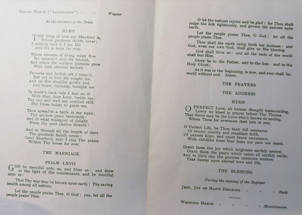 Constance Pyle made the wedding dress for Margaret Living-Taylor, daughter of Mrs Living-Taylor, headmistress of the Shrubbery School with Christopher Tongue, Constance’s son, went to school.