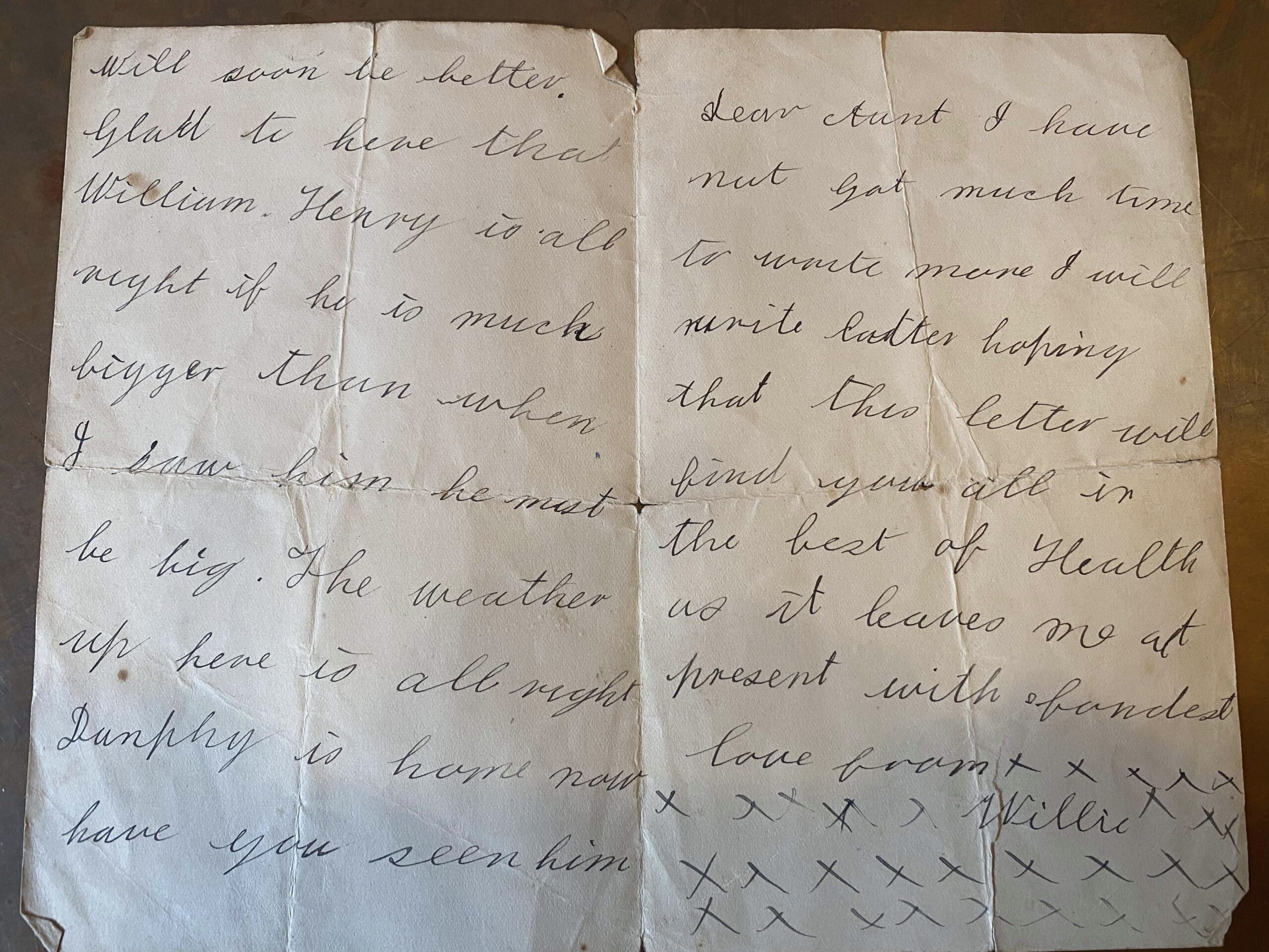 Dear Uncle and Aunt, just these few lines in answer to your welcome letter. I was sorry to hear that Aunt Ellen is not in the best of health. I hope that she will soon be better. Glad to hear that William Henry is all right if he is much bigger than when I saw him he must be big. The weather up here is all right. Dunphy is home now. Have you seen him? Dear Aunt I have not got much time to write more I will write later hoping the letter will find you all in the best of health as it leaves me at present with fondest love from Willie.